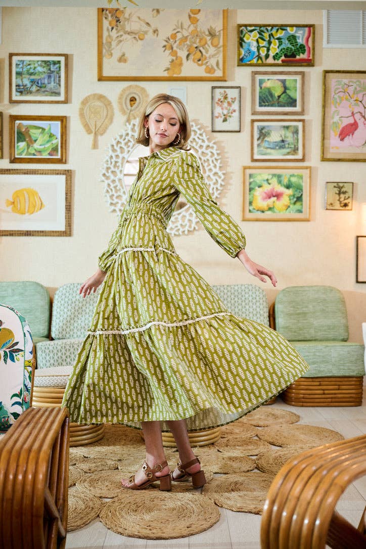 Back by popular demand, and this time with long sleeves. Designed for daydreaming, dining, and everything in between, our Banyan Long Sleeve Dress features a flattering elastic waist for all-day comfort and a button-up bodice for a hint of sophistication. Crafted from a soft cotton-spandex blend and digitally printed in our original Green Leaf print, it’s finished with delicate trim and an embroidered collar. Style her with tonal greens for a monochromatic moment or mix in shades of brown or navy to ground the look.