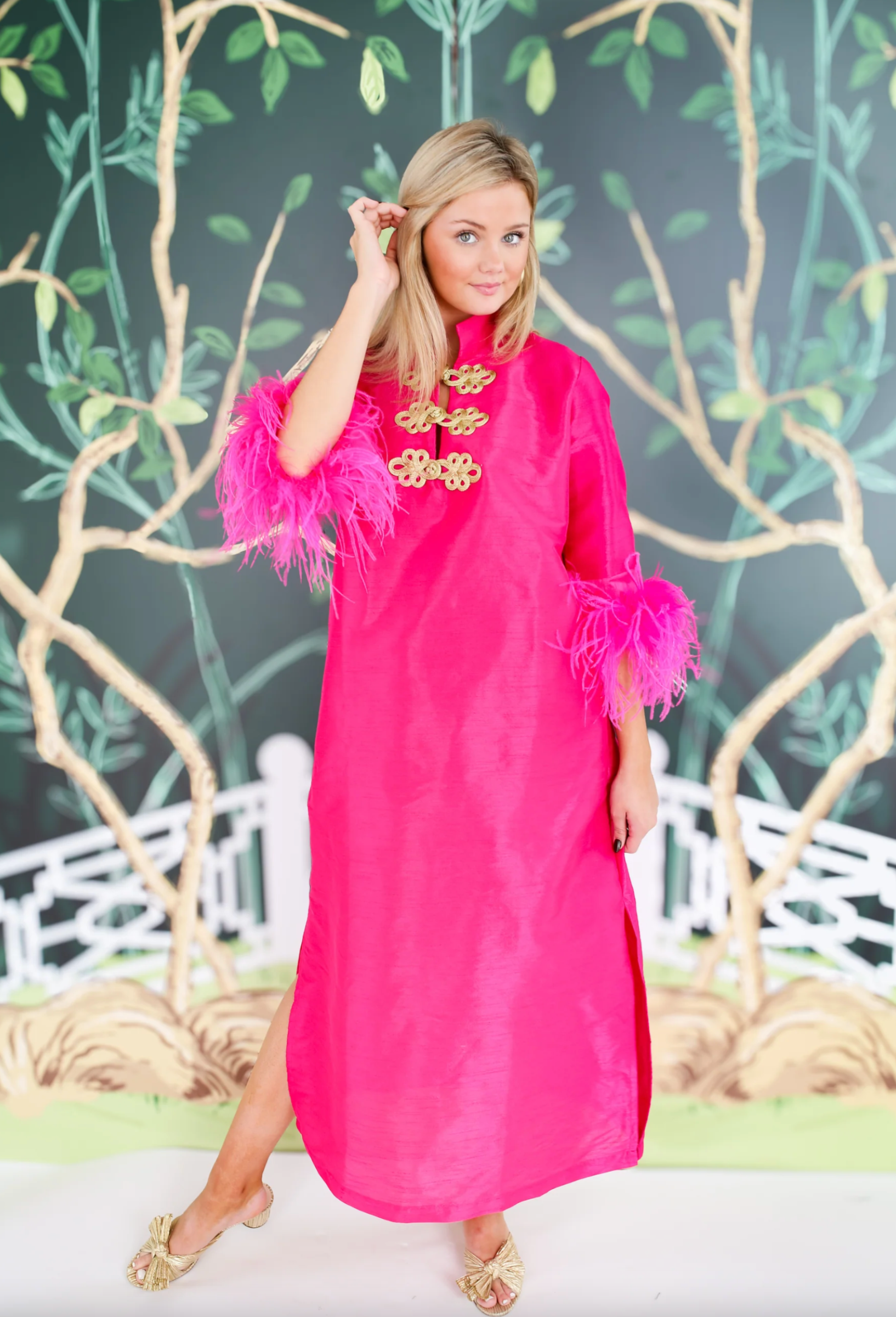 Our Bette is a true show stopper, with vintage gold frog closures and topped with the best ostrich feathers we could find. This will be an event staple.