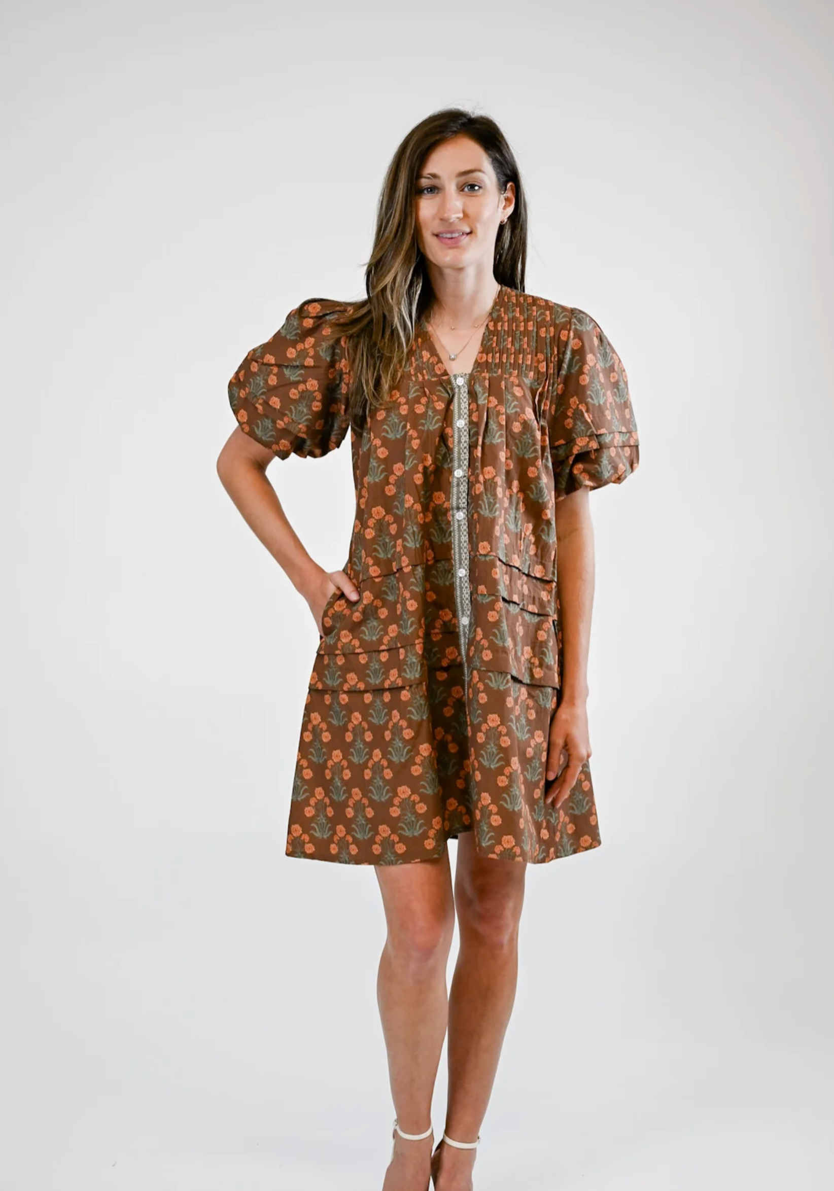 The Camille features short puff sleeves and a flattering A-line silhouette, perfect for any occasion. The front is adorned with decorative buttons and contrasting panels.