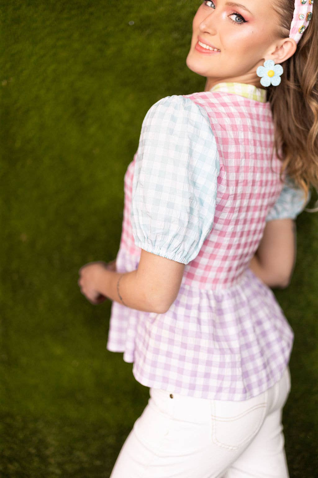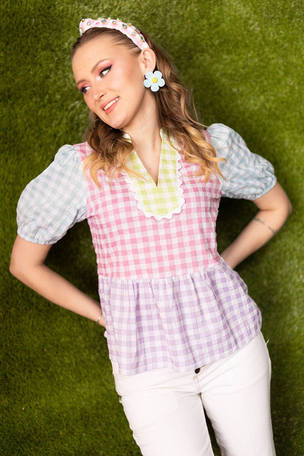 * Features a vibrant color block and classic gingham pattern, perfect for spring.