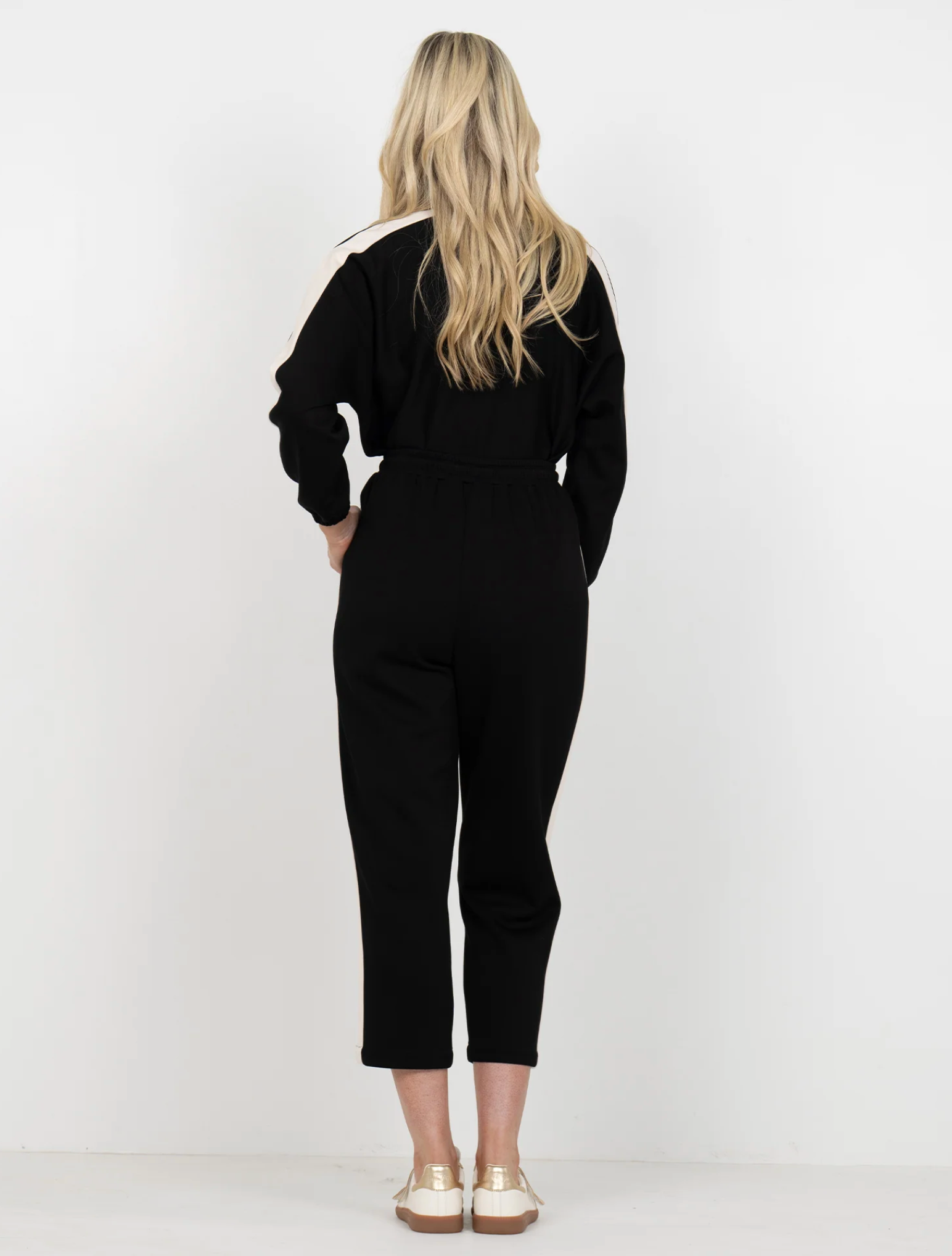 Where comfort meets confidence. The Joy Jogger in Midnight Vanilla is crafted from our signature luxe loom fabric, offering the perfect mix of softness, support, and stretch. Designed with a drawstring elastic waistband, side pockets, and a relaxed tapered leg, it redefines the classic jogger with a more polished silhouette. Unlike traditional cuffed hems, this style falls effortlessly for a sleeker look that transitions from lounging, to travel, to days out and about. The timeless color blocking adds a chic finish—pair with the matching Bailey Bomber or Long Sleeve Poppy for an elevated set that feels as luxurious as it looks.