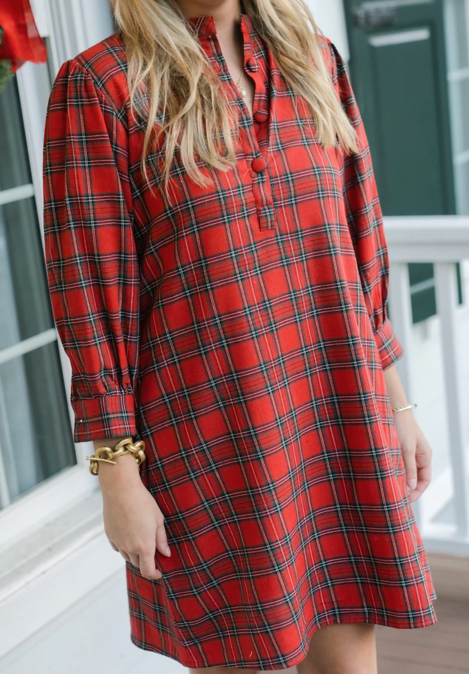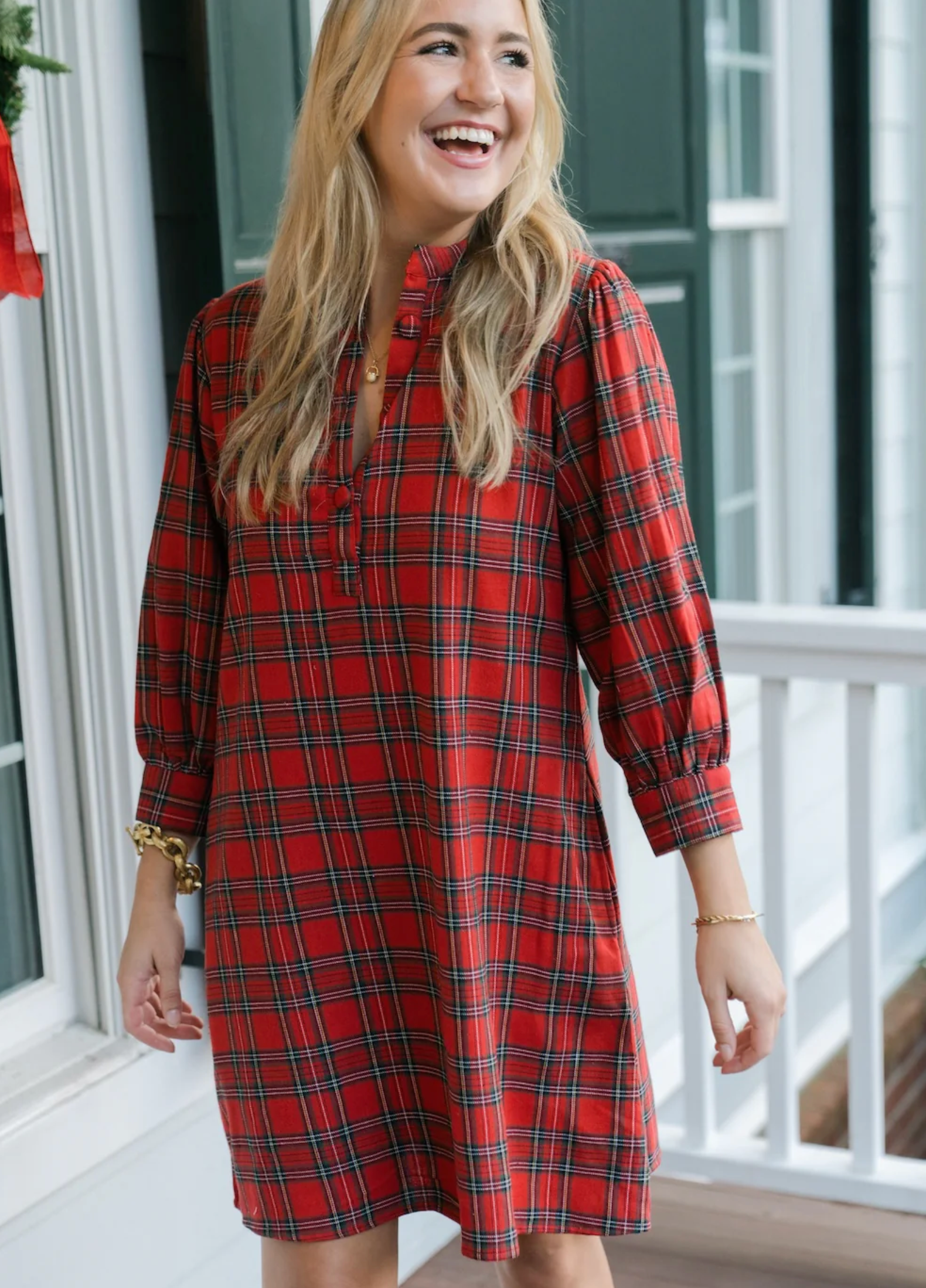 The Natalia features a relaxed silhouette with a partial button-front placket and a standing collar. Designed with three quarter sleeves that gather at the cuffs, it offers a comfortable and easy fit.